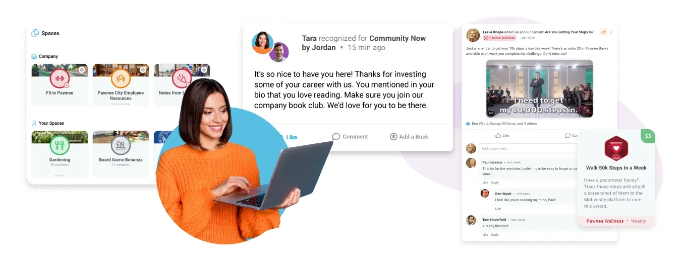 Managing all of your employee rewards is easier if it’s in one place. With Motivosity, you can offer employee rewards that run the gamut—physical products, swag, gift cards, and even intangible rewards like an extra day of PTO or a day for service. And with Spaces, it’s easy to build community and connection programs for your employees like book club, lunch and learns, wellness programs, and more.
